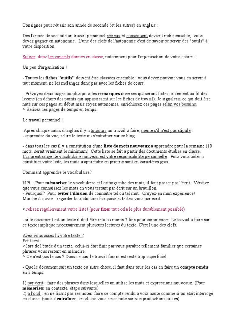 Consignes Travail Anglais Lexique Langue Anglaise